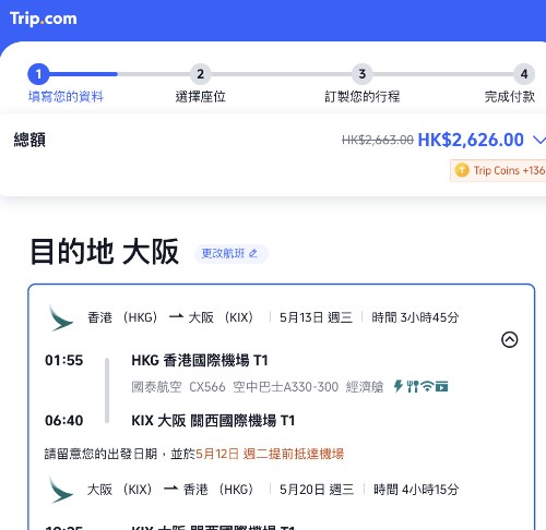 【國泰.大阪筍價】香港飛大阪來回連稅$2,626起!航班時間無限制!去程可揀早機 / 凌晨機,回程可揀晚機!4至6月出發