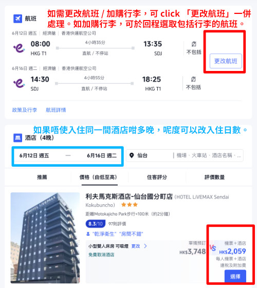 以上5日4夜只係例子,其實玩幾多日都冇問題,預訂時揀返想要嘅日子就可以了。如果打算去埋東北其他地方玩,唔使 book 晒咁多晚仙台酒店,只要喺搜尋之後,喺酒店嗰欄改返入住同退房日期,咁就可以彈性處理住宿嘅日數。