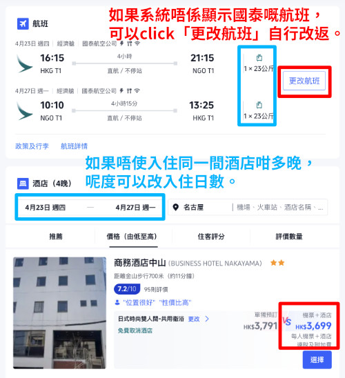 以4月23日出發,4月27日回程為例,HK Express 名古屋來回機票連以下酒店 (2人同行每位計):