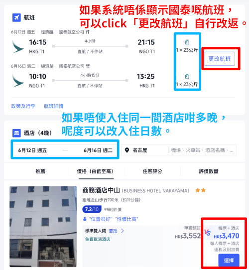 國泰航空名古屋套票再有抵價!經 Trip.com 預訂,國泰飛名古屋來回機票+酒店,早去晚返,5日4夜 (橫跨週末) 連稅只需三千四起、8日7夜三千八起!呢個價係下午機去早機返!加約 $367 可改為早機去 或 晚機返。
