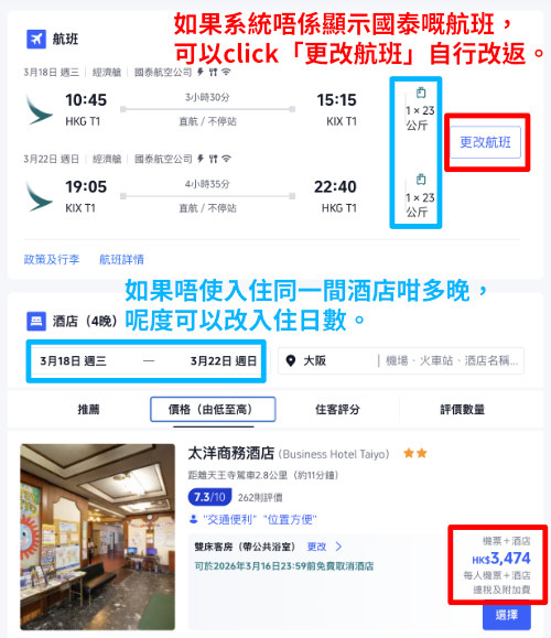 (可自行選擇其他航空公司如港航、HK Express 等,價錢會相應調整)