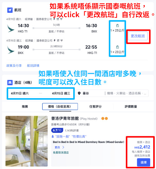 (可自行選擇其他航空公司如泰航、港航等、HK Express 等,價錢會相應調整)