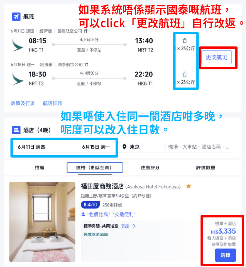 以上5日4夜只係例子,最長可以玩8日7夜,預訂時揀返想要嘅日子就可以了。如果打算去埋關東其他地方玩,唔使 book 晒咁多晚東京酒店,只要喺搜尋之後,喺酒店嗰欄改返入住同退房日期,咁就可以彈性處理住宿嘅日數。