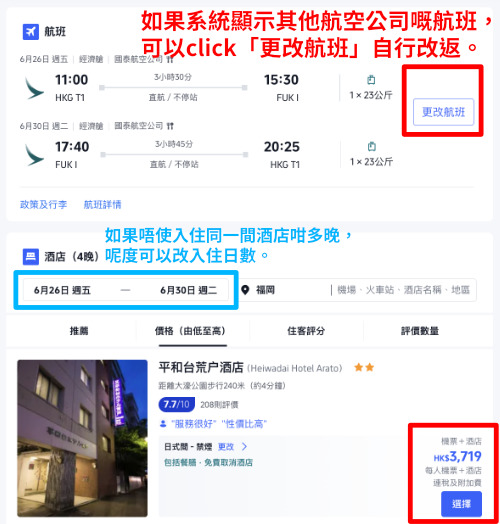 (可自行選擇其他航空公司如港航、HK Express 等,價錢會相應調整)