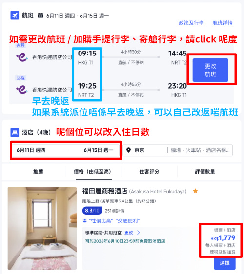 以6月11日出發,6月15日回程為例,HK Express 東京來回機票連以下酒店 (2人同行每位計):