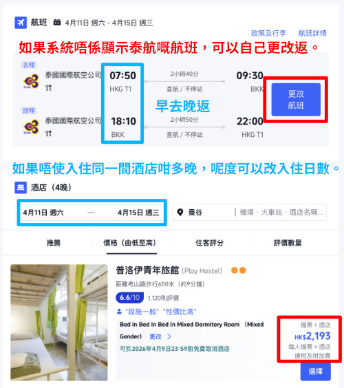 以4月11日出發,4月15日為例,泰國航空.曼谷來回機票連以下酒店 (2人同行每位計):