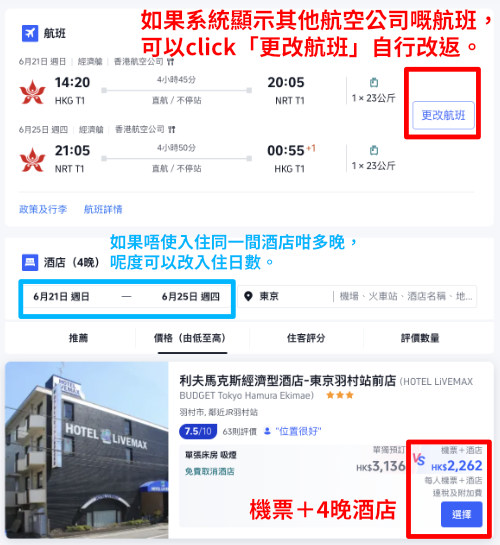 以上5日4夜只係例子,最長可以玩8日7夜,預訂時揀返想要嘅日子就可以了。如果打算去埋關東其他地方玩,唔使 book 晒咁多晚東京酒店,只要喺搜尋之後,喺酒店嗰欄改返入住同退房日期,咁就可以彈性處理住宿嘅日數。