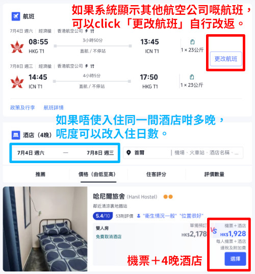 以2026年7月4日出發,7月8日回程為例,香港航空.首爾來回機票連以下酒店 (2人同行每位計):