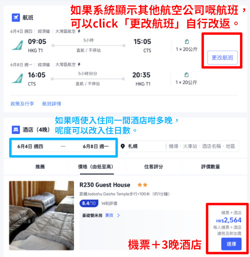 以2026年6月4日 (星期四) 出發,6月8日 (星期一) 回程為例,大灣區航空.札幌來回機票連以下酒店 (2人同行每位計)