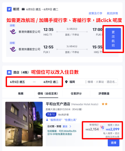 以上5日4夜只係例子,其實玩幾多日都冇問題,預訂時揀返想要嘅日子就可以了。如果打算去埋九州其他地方玩,唔使 book 晒咁多晚福岡酒店,只要喺搜尋之後,喺酒店嗰欄改返入住同退房日期,咁就可以彈性處理住宿嘅日數。