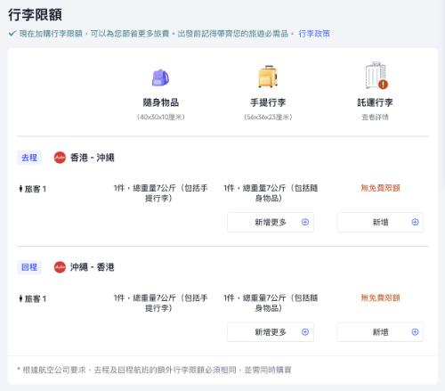 如加一件20kg 寄艙行李:每程加約 $240起