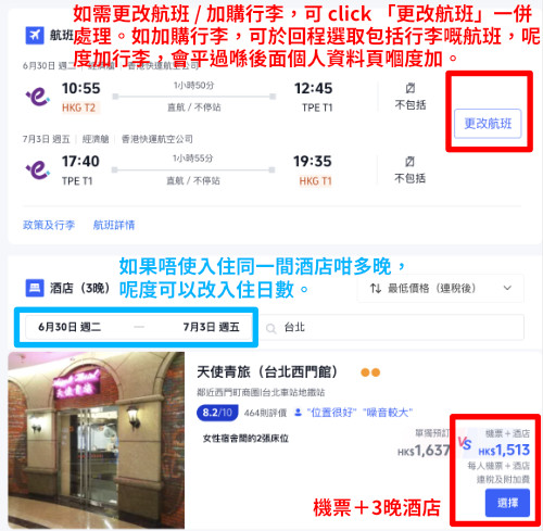 以2026年6月30日出發,7月3日回程為例,HK Express 台北來回機票連以下酒店 (2人同行每位計):