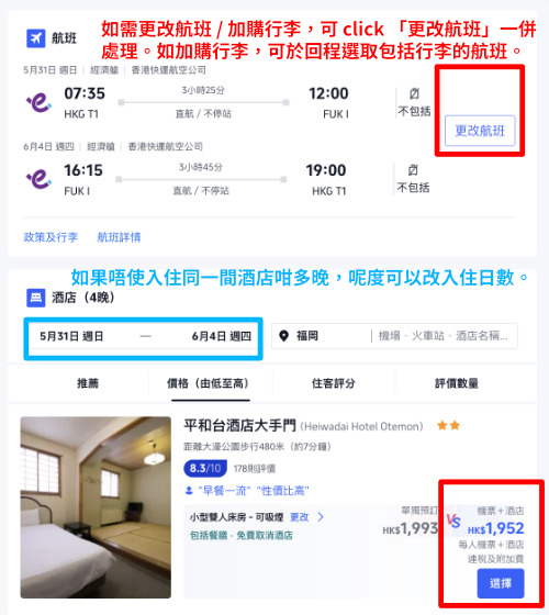 以上5日4夜只係例子,其實玩幾多日都冇問題,預訂時揀返想要嘅日子就可以了。如果打算去埋九州其他地方玩,唔使 book 晒咁多晚福岡酒店,只要喺搜尋之後,喺酒店嗰欄改返入住同退房日期,咁就可以彈性處理住宿嘅日數。
