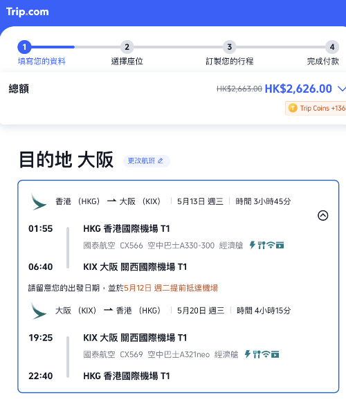 (於付款頁輸入98折優惠碼【TRAVELERHK26F】後,來回連稅:$2,626起)