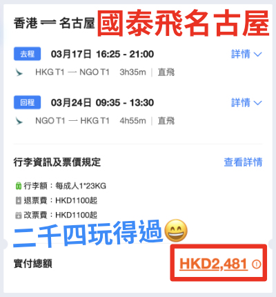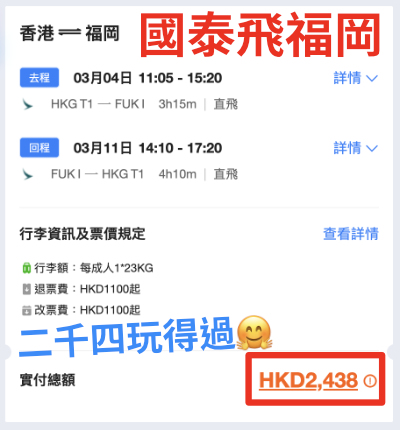(來回連稅:福岡 $2,633起、大阪 $2,692起、名古屋 $2,668起、東京成田 $2,738起)