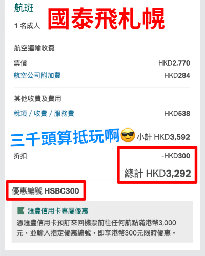經國泰官網預訂,用滙豐信用卡優惠碼【HSBC300】減 $300後,札幌來回連稅只需 $3,292起!