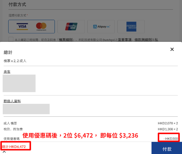 以上價錢係使用滙豐 easy 信用卡/ 白金 Visa 卡優惠碼【HSBCGO300】 (連稅滿滿 $5,000 減 $300) 後嘅票價。如果無滙豐卡,來回連稅每位 $3,386起!