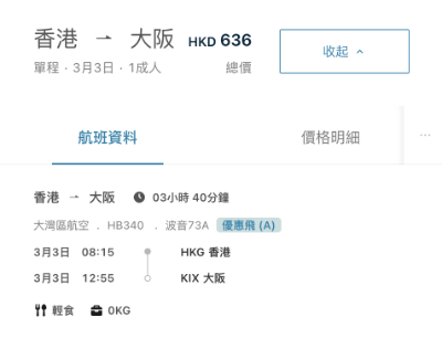 (去程用優惠券碼後,香港飛大阪連稅只需 $636起 (包7kg手提行李+輕食);$706 (包20kg 寄艙行李+7kg手提行李+輕食))