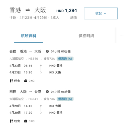 大灣區航空飛大阪單程都有快閃優惠!去程及回程都有平。