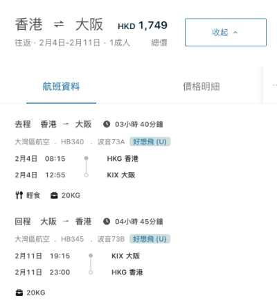 香港-大阪 HB340 08:15/12:55、HB344 13:40/18:15