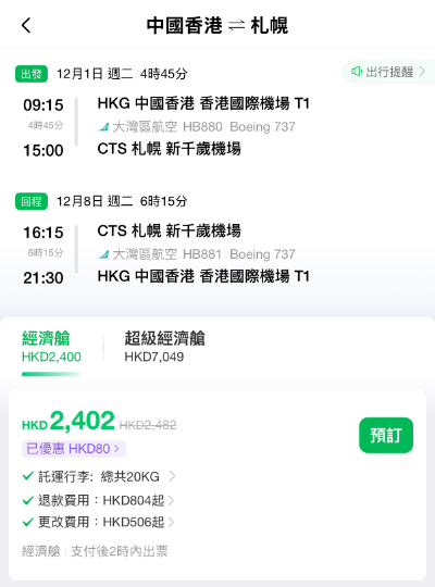 香港飛札幌來回連稅 $2,402起!呢口價已經包咗20kg 寄艙行李+7kg 手提行李+隨身個人物品 +輕食!