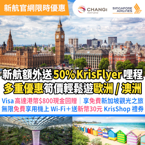 嘩!筍呀!選乘新航歐洲 / 澳洲之旅,享額外 50% KrisFlyer 哩程!