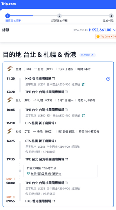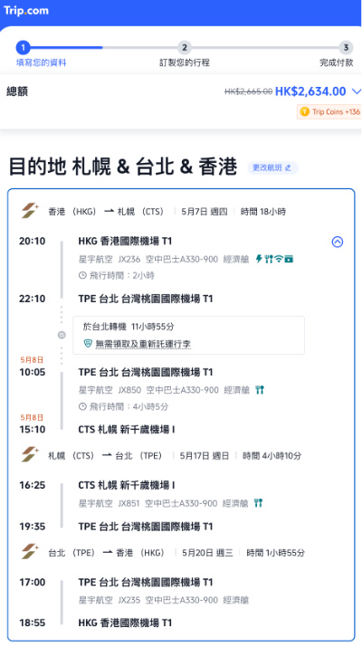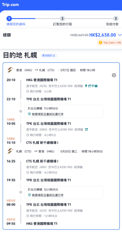 第一程 (5月7日) 香港經台北轉飛札幌;第二程 (5月17日) 札幌飛台北、第三程 (5月20日) 台北飛香港:連稅 $2,634起