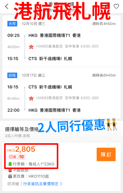 經永安旅遊 / Trip.com 預訂,香港來回札幌連稅只需 $2,805起!票價已包23kg 寄艙行李+7kg手提行李。