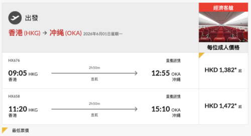 搜尋時輸入優惠碼【HKAGOJPN】,香港飛沖繩來回連稅 $1,382起!包23kg 寄艙行李+7kg 手提行李+1件隨身物品+飛機餐。