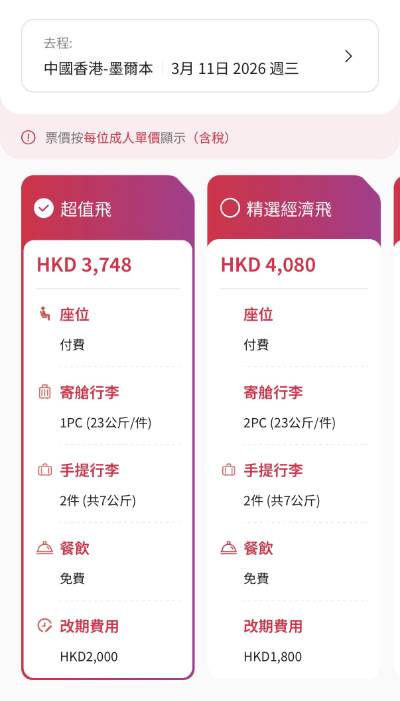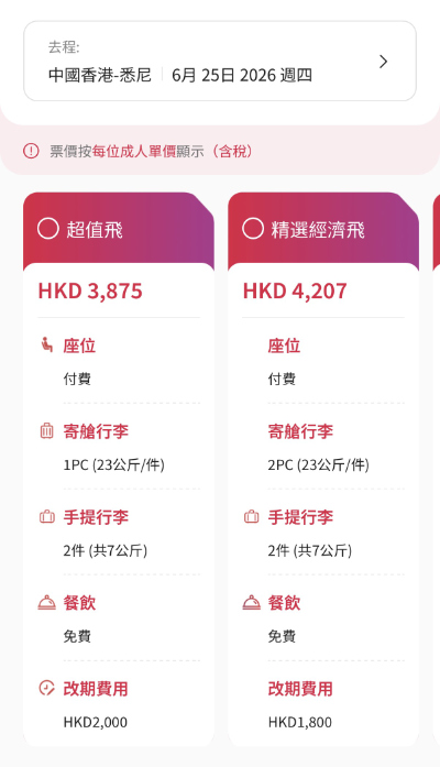 來回連稅:墨爾本 $3,748起、悉尼 $3,875起