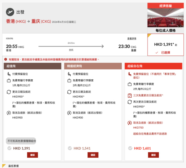 香港航空重慶早鳥優惠!香港飛重慶來回連稅只需 $1,391起!呢個價已包1件23kg 寄艙行李+1件手提行李及1件隨身物品。
