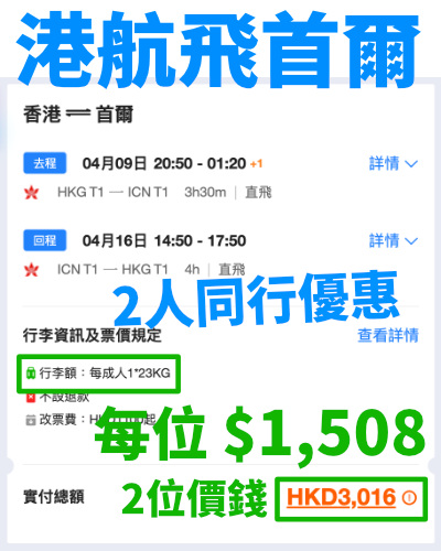【港航.韓國2人同行抵價】香港飛首爾來回連稅$1,508起!包23kg寄艙行李+7kg手提行李!明年2至7月出發|香港航空