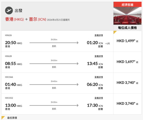 於港航官網預訂,搜尋時輸入優惠碼【HKACNY26】,香港飛首爾來回連稅 $1,499起!包23kg 寄艙行李+7kg 手提行李+1件隨身物品+飛機餐。