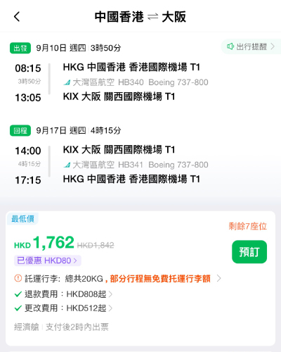 香港飛大阪來回連稅 $1,712起!留意,呢個價去程唔包寄艙行李,回程就包20kg 寄艙行李。