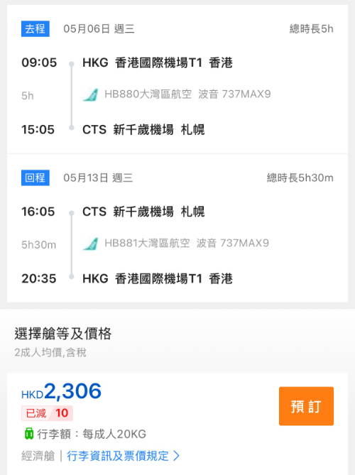 2人同行,香港飛札幌來回連稅 $2,306起!呢口價已經包咗20kg 寄艙行李+7kg 手提行李+隨身個人物品 +輕食!