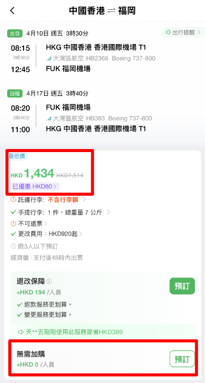 香港飛福岡 來回連稅 $1,434起!呢個價只包手提行李,唔包寄艙行李。