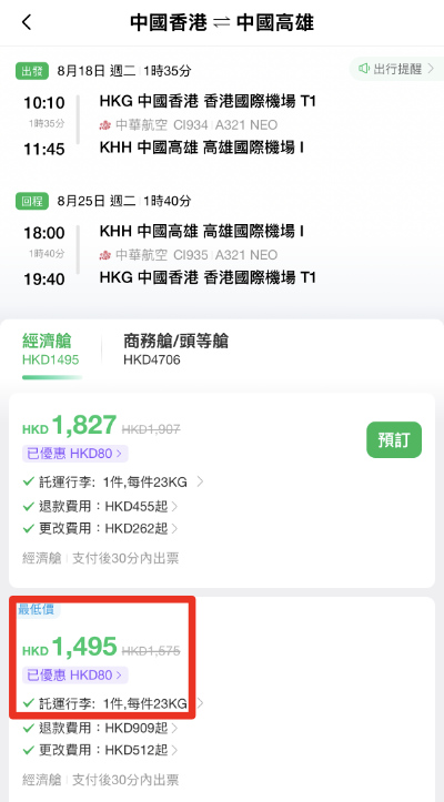 (使用優惠碼:新客戶減 $80 / 現有客戶減 $5 後,來回連稅:高雄 $1,474起、台北 $1,524起)