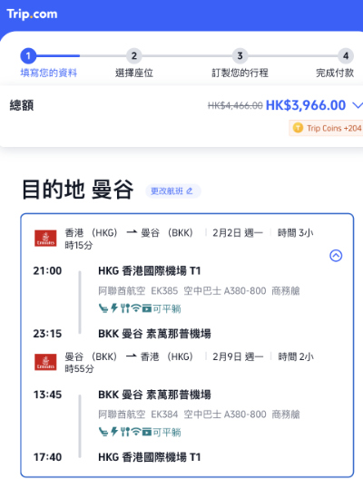 阿聯酋航空飛曼谷商務艙有泰抵 Deal!經 Trip.com 預訂,使用優惠碼【GXJFIDURGS】減 $500 後,香港飛曼谷 Business Class 來回連稅只需 $3,966起!