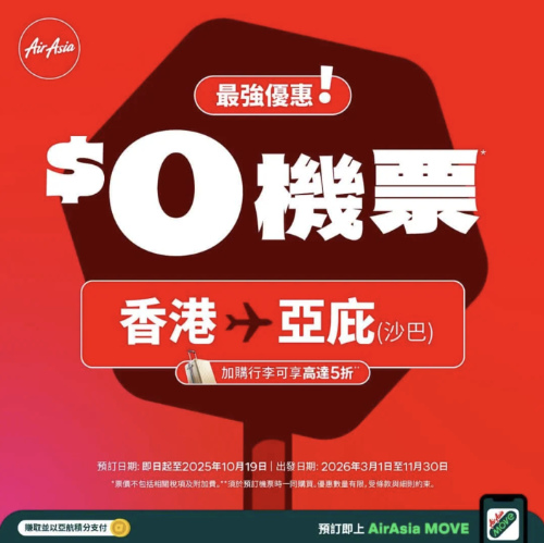 旅行日期至明年11月30日。有興趣可以上 AirAsia 官網或者 AirAsia MOVE 搶飛。