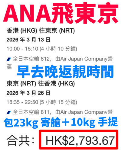 ANA 全日空飛東京 (成田) 有新優惠,來回連稅 $2,794起!航班時間靚仔,係早去晚返。出發日期至明年3月20日,更可以停留長達21日。