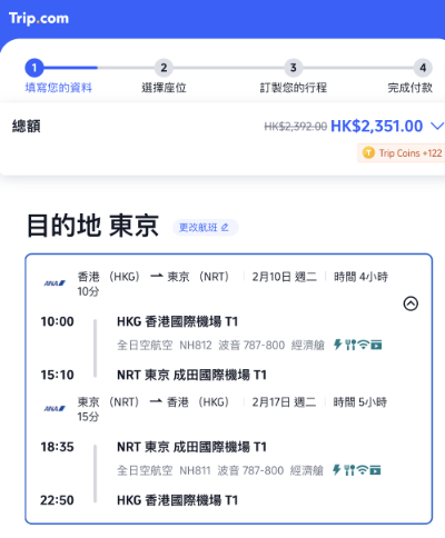 (使用98折優惠碼「TRAVELERHK26F」後,來回連稅:東京成田 $2,351起、東京羽田 $2,514起)