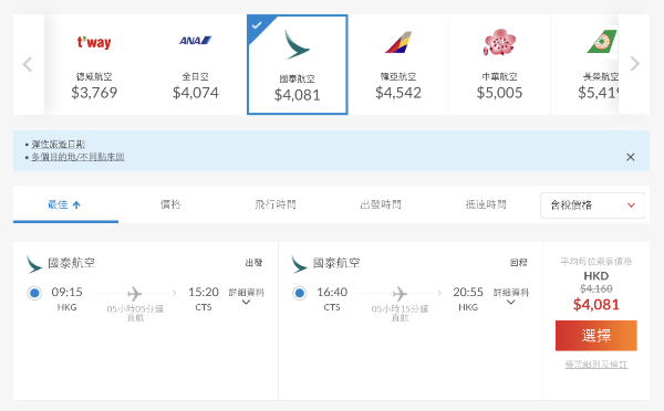 國泰北海道二人同行優惠!香港飛札幌來回連稅 $4,081起