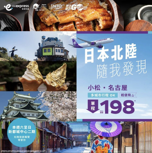 (於付款頁輸入98折優惠碼「TRAVELERHK26F」後,來回連稅:名古屋:$1,235起;小松:$1,184起)