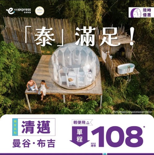 【HK Express 泰國限時優惠】曼谷 / 布吉 / 清邁單程$108起!來回連稅$1,120起|2月至6月出發 (優惠至1月28日)