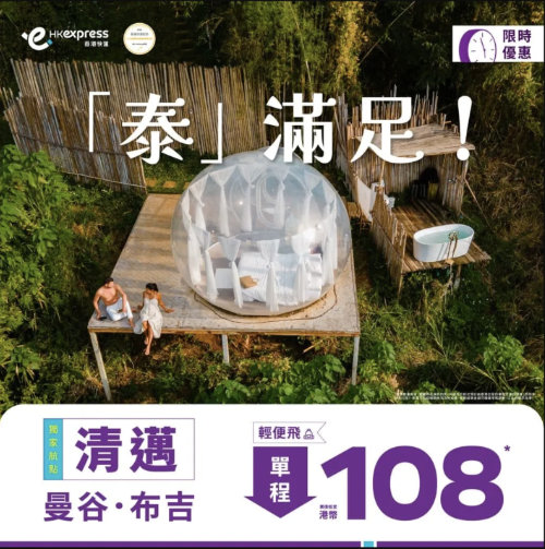 【HK Express 泰國限時優惠】曼谷 / 布吉 / 清邁單程$108起!來回連稅$1,120起|2月至6月出發 (優惠至1月28日)