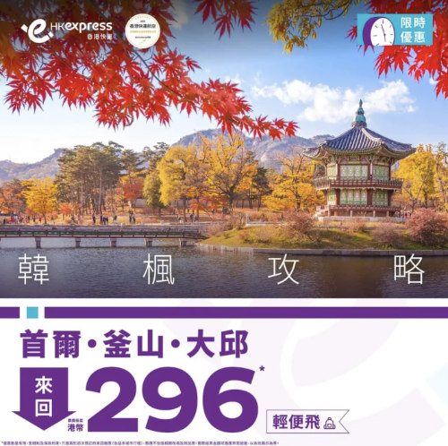 【HK Express 韓國限時優惠】香港飛首爾 / 釜山 / 大邱$148起!10月至明年3月出發 (優惠至10月7日)