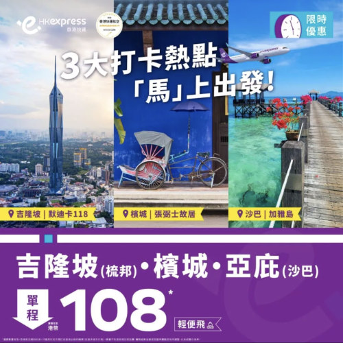 HK Express 推出泰國限時優惠!香港飛檳城 / 亞庇 (沙巴) / 吉隆坡 (梳邦) 單程 $108起!來回連稅 $1,093起!