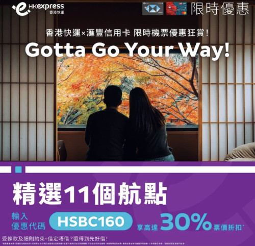 優惠需於 HK Express 網頁版預訂,並輸入優惠代碼【HSBC160】及以滙豐信用卡付款。