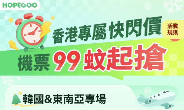 HopeGoo 推出 $99 單程機票快閃優惠!即日起至12月16日,一連7日每日推出唔同航點嘅快閃機票優惠!包括:首爾、釜山、濟州、曼谷、清邁、布吉、新加坡、吉隆坡、富國島及河內!