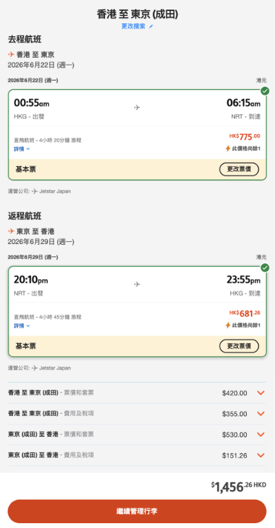 (提提您:搜尋後所顯示嘅係已連稅票價,去程連稅 $775起,回程連稅 $681起就係今次嘅目標價)